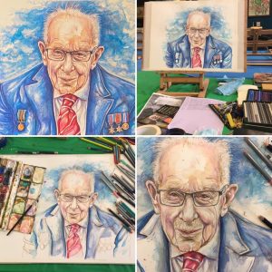 I went to The Art Studio often when I could access but no students were permitted. It was a strange period of time and I really missed people interaction. It was great to see students again when restrictions began to lift but over the years as the variants came and went things went back and forth and it was an unsettling time for many people. I used the time to do some artwork, developed remote teaching skills and sorted out some things. I enjoyed capturing the inspiring Sir Captain Tom Moore and produced him as a card and postcard. The man so inspired me in that first year of lockdown, he really lifted me when all around was doom and gloom.